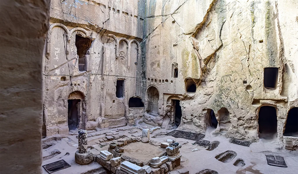 The monastery, built far from settlement centers, features a large courtyard at its center. From this square-shaped courtyard, one can access the monastery’s church and other sections. Burial chambers are located on the northern side of the courtyard, while a multi-level underground city lies to the south. This underground city indicates the monastery’s use for defense and concealment purposes. The church’s interior, which includes a chapel, refectory, and monk cells, is decorated with frescoes considered among the significant examples of Byzantine art.