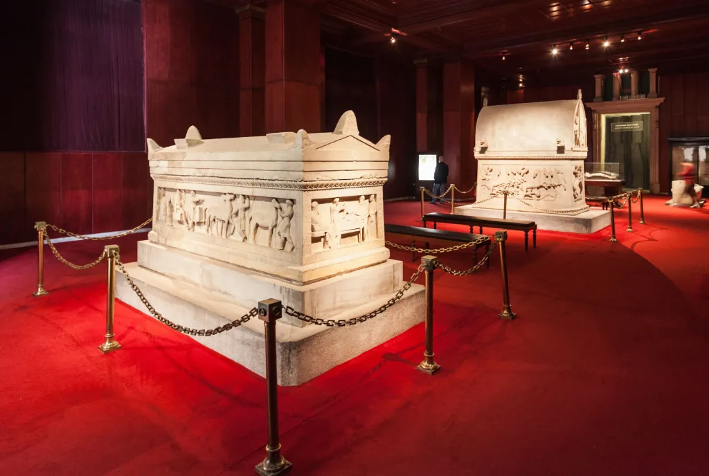 Another treasure in the museum is the Sidamara Sarcophagus, one of the largest sarcophagi ever found. Discovered in Ereğli, the sarcophagus was so massive that it took 40 oxen to move it to the Konya railway, and required specially modified train cars to reach Istanbul. Dating to the 3rd century CE, its richly detailed reliefs are a striking representation of Roman funerary art.