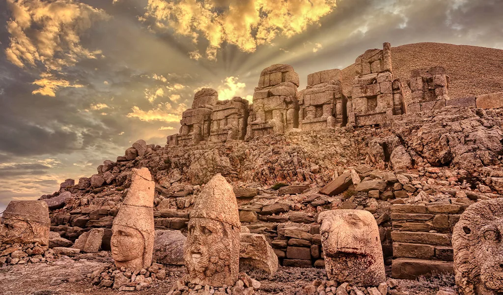 The Mount Nemrut Ruins, one of the most visited historical sites in Southeastern Turkey, houses colossal limestone statues built by King Antiochus I of Commagene. A UNESCO World Heritage Site since 1987, it offers a surreal visit between 4 AM and 9 AM, when the statues are bathed in morning light. This magical place is also available virtually: click and explore!