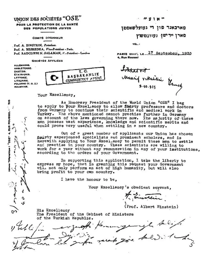 Before seeking refuge in the U.S., Einstein attempted to help the remaining scientists. In a letter to Turkey, he proposed the acceptance of 40 individuals (Israel State Archives, Doc. 54). However, due to the limited number of universities and budget constraints, Turkey regretfully declined.