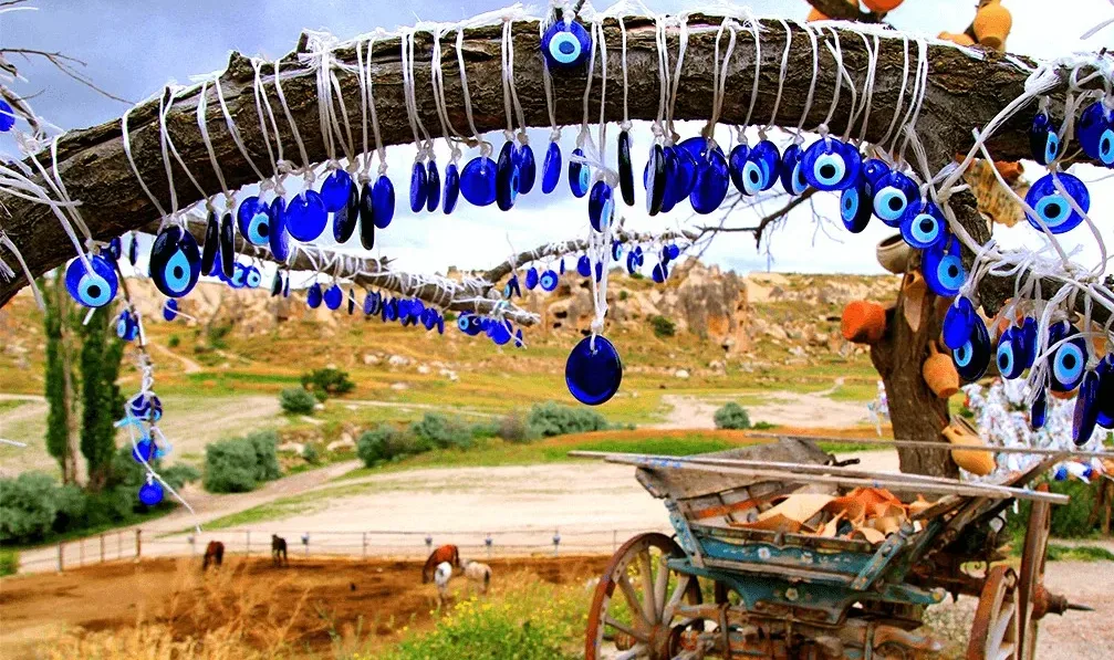 Throughout Turkish history, numerous items were believed to offer protection against the evil eye: horseshoes, garlic, eggshells, dried thistles, red coral, black cumin seeds, turtle shells, children’s shoes, agate stones, and even wolf teeth. Nevertheless, the evil eye bead remains the most favored and widely accepted amulet today. In fact, it’s common to see horseshoes adorned with evil eye beads on house walls.
