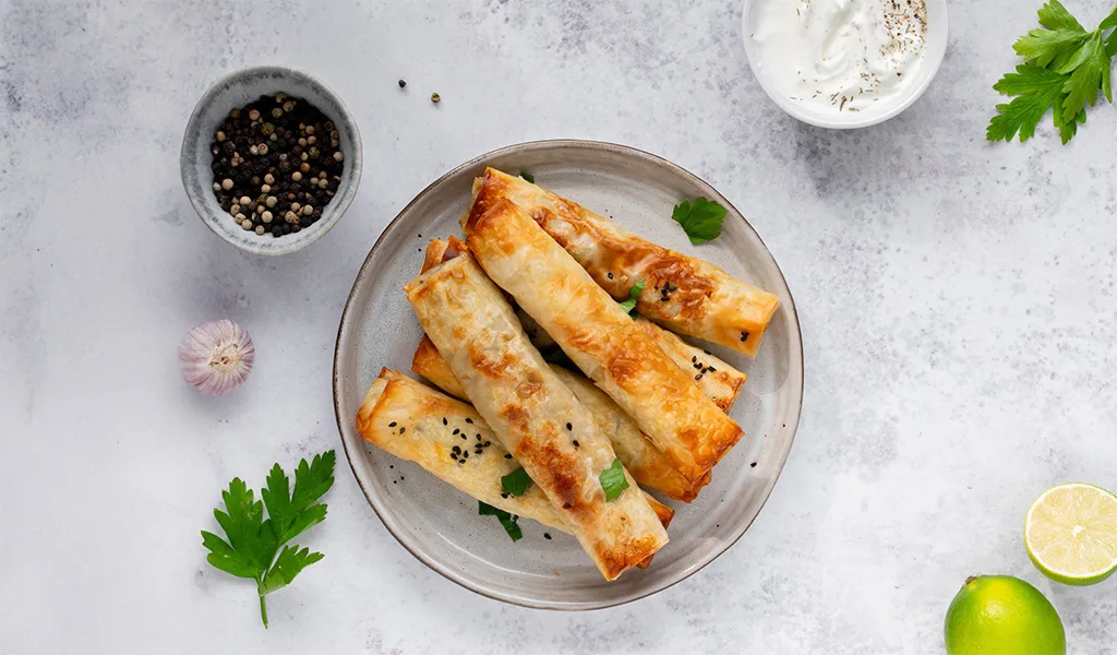 One of the tastiest böreks in Turkish cuisine, this variant is filled with pastrami, kashar cheese, tomato, and green pepper. The filling is wrapped in halved phyllo sheets and lightly rolled, then deep-fried until crispy.