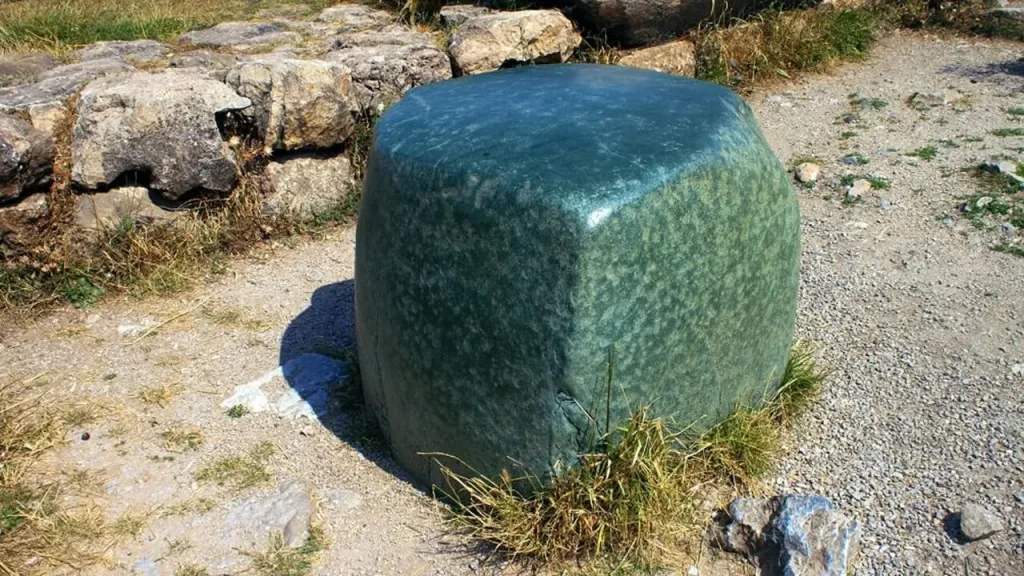 Now to the most captivating mystery: the Green Stone of Hattusa. This enigmatic monolith is located in the heart of the Great Temple complex, a sacred site that once hosted major religious ceremonies. The stone’s function is still unclear, but its striking appearance has made it a symbol of ancient mystery. Perfectly smooth, dark green, and brilliantly reflective, the stone appears almost polished. Some scholars speculate that it might have been a diplomatic gift from Pharaoh Ramesses II following the Kadesh Treaty, though no direct evidence supports this claim.