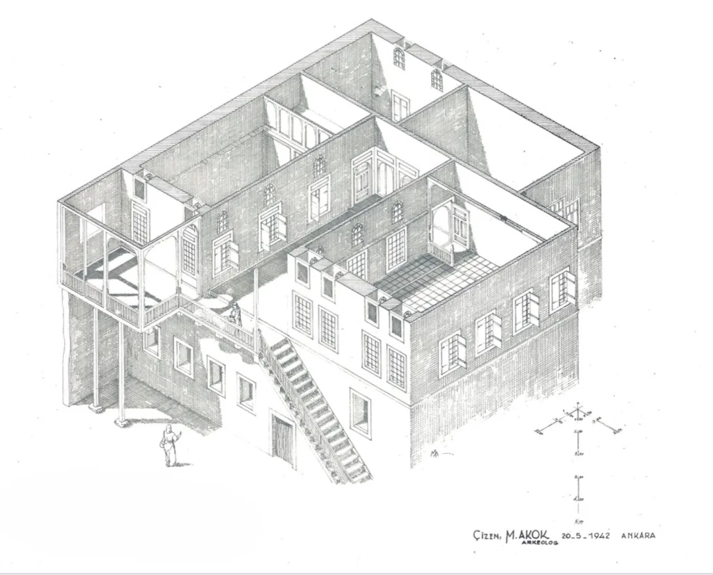 The Seyregâhs, the balconies of historical Ankara houses, are positioned facing the front courtyard of the house, offering a clear view towards the east and partially towards the south. The Russian painter Lansere also depicted the same Ankara house in 1922, together with Harbi Hotan Hoca.