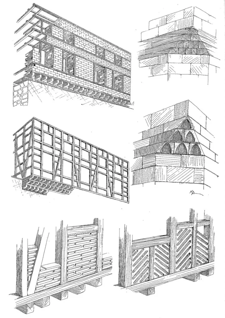 Ankara houses are generally two-story, sometimes three if a mezzanine is present. They are modest, simple, with central halls and oriel windows (cumba). Older houses were single-story, made of adobe with flat earth roofs. The floor plan of these houses follows the ancient “Hilani” type found in Anatolia. The stone foundation supports walls of stone masonry, with adobe and wooden reinforcement bands. The upper walls were mostly constructed using a timber frame filled with bricks or adobe. The so-called Ankara stone used in foundations is a lime-rich andesite, a volcanic stone. Lower stone walls were plastered with lime for aesthetics and cleanliness, while adobe construction was eventually replaced with wooden frameworks.