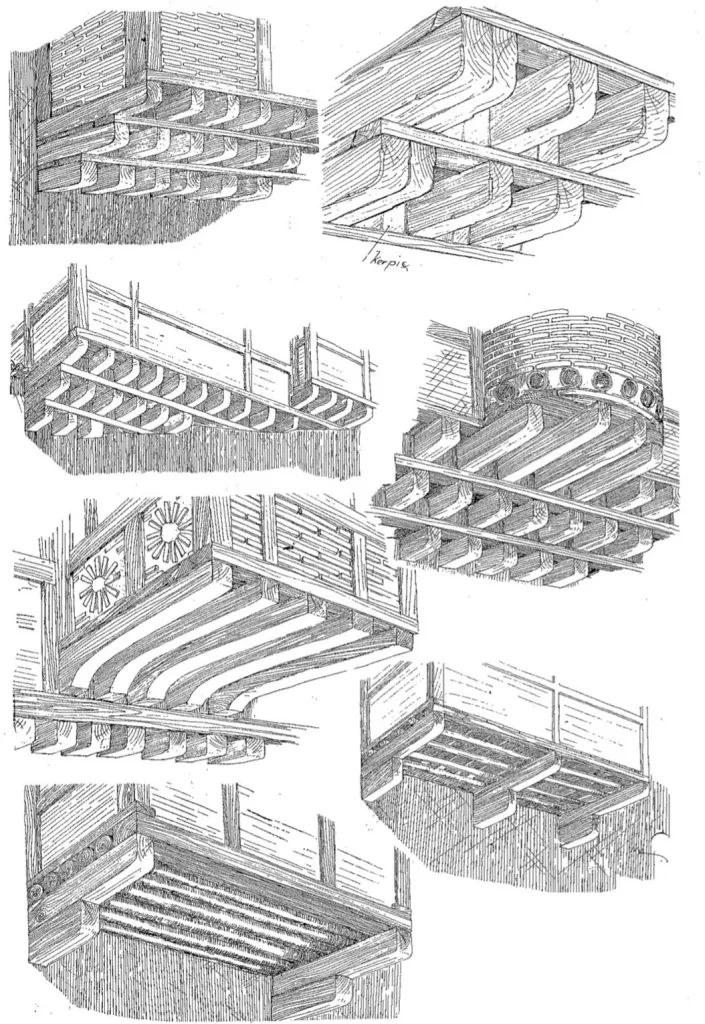 Oriel windows (cumba) were almost universal, often supported without visible brackets (bingi).