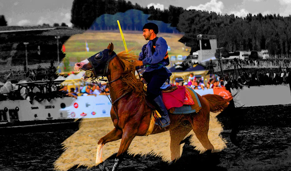 Players wear traditional garments: baggy trousers, vests, wide sashes, and distinct headgear. The horses are also decorated, with saddles and harnesses adorned with regional motifs, adding a visual richness to the sport.